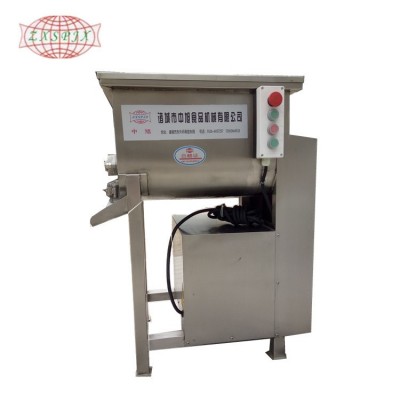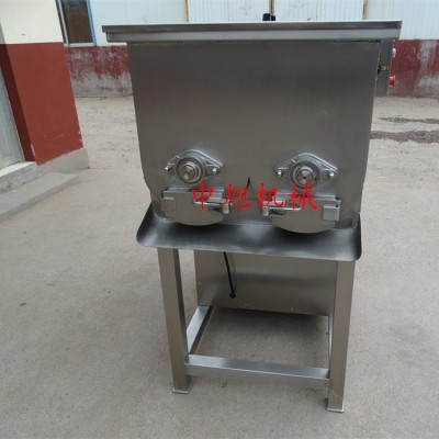 雙絞攏型攪拌機是一種在稍帶圓形的底部深處裝有一根帶有多個匙子的軸的機械。在旋轉軸上固定有槳狀葉片。葉片與軸之間形成45度左右的夾角,通過軸的旋轉使里面的餡前后運動,位于兩端的葉片在與船形槽壁相接的一端成可將擠到直角壁邊上的餡鏟起,送到槽的中央部。單軸絞龍拌餡機是正反轉式攪拌,傾斜式翻斗出料。各類肉品伴調味料,水餃餡、包子餡、油飯、肉粽、香腸肉、排骨肉、素菜,海帶加工等物品混合攪伴,使食物均勻及肉
